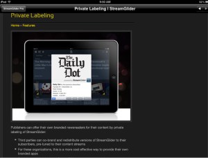 It could be that StreamGlider wants to be a slick, customizable transport vehicle, rather than an aggregator. According to the website, interested parties can distribute private-labeled or co-branded content via StreamGlider to closed audiences. This model could be interesting for companies looking for a sure-fire way to reach customers or prospects who opt in to get tailored relevant content, such as a private-labeled corporate news magazine. But whether the app has real value for both consumers and publishers will depend on how well it’s able to marry the right content with the right audience.