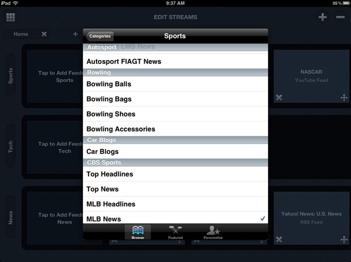 And this is where the app stumbles. While the app includes standard browsing buckets, several buckets don’t have many feeds from which to choose. If feeds readers wants are not on the list, they’ll need to do a search. But if their feed doesn’t advertise with StreamGlider, it won’t show up in a search. I tried all sorts of feed names and URLs, well known and obscure, and not one of them came up lucky. Even a search of “baseball” – an active topic with spring training around the corner – yielded nothing.