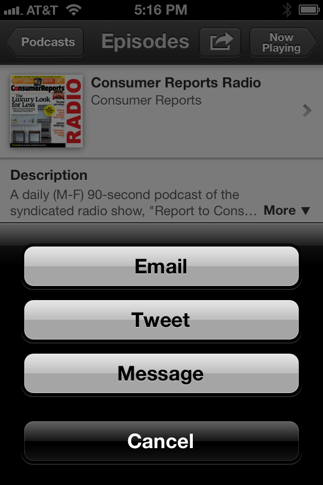 Apple also add the ability to Tweet, iMessage or Email the Podcast as you listen. That is a nice feature which should make Podcasts more social and increase the virality of podcasting.