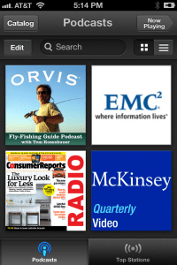 Under the Top Stations section, users can quickly flip through sections to discover, listen and subscribe to new podcasts. New audio controls include the ability to skip back 10 seconds or move forward 30 ala DirecTV. In the upper right is a “Catalog” button which takes you back to the iTunes Podcast interface. Subscriptions are synced back to iTunes.