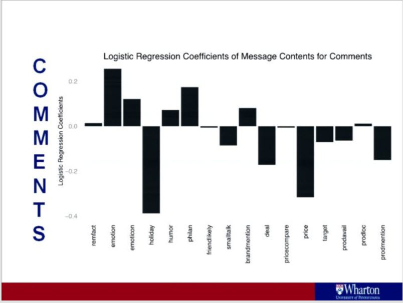 Today Wharton Professor Kartik Hosanagar held a webinar to discuss new research on Facebook Content Strategies. Professor Hosanager used a data set of 106,316 Facebook Posts from 782 companies. Those posts were categorized into 16 different content types (humor, philanthropy, product, deal, etc.). They reviewed the 450 million page fan responses to that content to determine content effectiveness for Likes and Comments on Facebook.