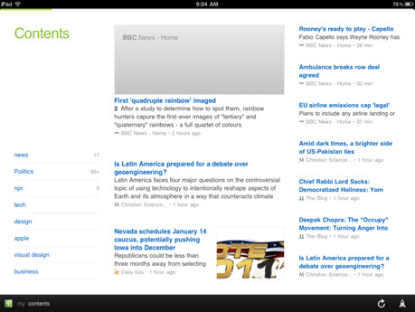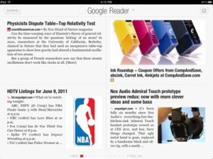 First, it exploits iPad usability to improve the news-grazing experience. Gizmodo got it right when it said, “Its biggest accomplishment is solving the simple problem of making it easy to move through news items.” In that regard, Reeder clearly caters to hardcore RSS feed enthusiasts like me.