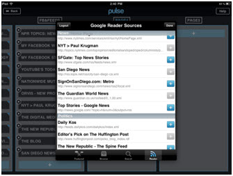 So just how does a reader get your company’s content into their Pulse app? Right now, readers can add and delete up to 60 sources on five configurable pages in a few ways. They choose from featured sources (Groupon, New York Observer, Apple News, Android News, Daily Intel, and more) or browse sources by category (Business, Entertainment, Fashion, Food, Gaming, News & Analysis, Politics, Social, Sports, and Technology to name a few). If readers want to find a particular news source, such as your company blog or Twitter feed, they can search by feed URL (a distinct advantage over Flipboard) or by keyword. The search quality is okay, but not great. I had trouble finding a few feeds. However, readers that don’t find the content they want through the search capability can pull any RSS feed they want into Pulse from their Google Reader.