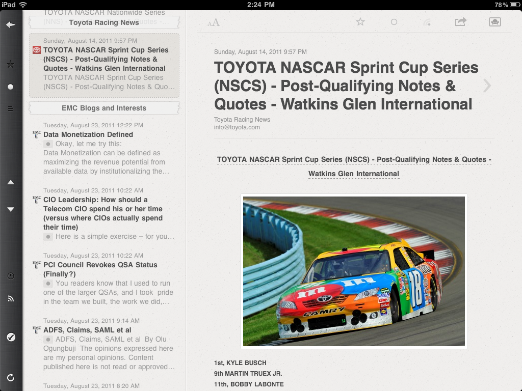Another reason people love Reeder is that it syncs with Google Reader quickly and seamlessly. On start-up, it took under 30 seconds for Reeder to grab all my Google Reader feeds. That initial grab complete, it now syncs in about a second. If you read an article in Reeder, it’s marked as read in Google Reader and vice versa. This seamless syncing means you can consume feeds much faster. Sure, you could read RSS feeds for free by visiting www.google.com/reader via the Safari web browser or by downloading Google’s free iPad and iPad reader apps. But many people are choosing to pay $4.99 for Reeder because its caching significantly speeds the experience, especially when you’re relying on a mobile phone data network. In fact, Reeder’s popularity consistently earns it a place on the “Top Paid iPad Apps” list in the news category. And that’s no small accomplishment for an app developed for the fastest growing computing platform.