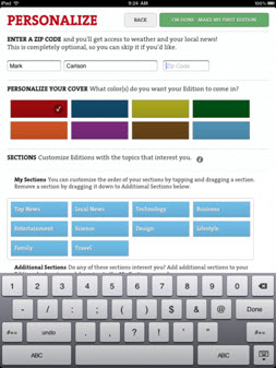 After choosing a social network (or choosing not to connect to a social network) readers enter their zip code and select 10 sections from a list that includes topics such as Top News, Technology, Business, Entertainment, Sports, and Local News. Then, the app assembles the magazine – it took several minutes to build my first edition.