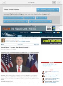 When readers open a story, the app displays terms associated with it. For example, when I opened an article on Rick Perry’s presidential bid, the terms included Federal Reserve System, Texas, Prayer, Republican Party, and The Republican. Readers let the app know which terms they like and which they don’t by giving each a check or an X. They can also give a thumbs up or down to the content source, such as TheAtlantic.com.