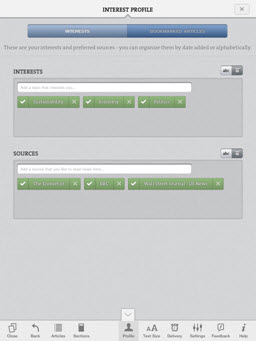 When a reader loads Zite for the first time, it asks for access to his or her Twitter, Google Reader, Delicious, and Read It Later accounts. It checks out their profile along with the people and sources they follow to get a bead on their interests. Presumably, the greater access you give Zite to these services, the better content you’ll get in return.