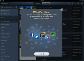 Readers tap the “Settings” menu to sync News360° with social media, bookmarking, and RSS reader sites, including Facebook, Twitter, Evernote, Google Plus, Google Reader, and more. When I synced with Google Reader, News360° automatically pulled topics into the “My Interests” area for aggregation with the topics I’d already chosen within the app.