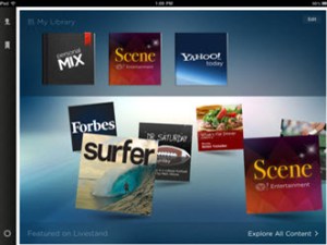Users can log in either using Yahoo! or Facebook accounts. I’ve been a Yahoo! user long enough that there’s lots of personal fodder on my MyYahoo! page: sports teams, weather, news groups, favorite modules. So I expected the personalization to be pretty good. I was disappointed by the content Livestand thought I’d like. Sports and parenting? Yes. But motor cyclist? Not even close.