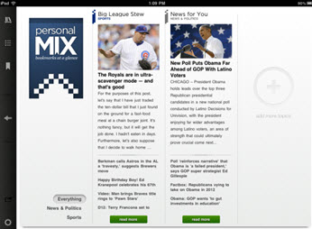 The reader experience: C. It’s functional and pretty for users looking to browse content in pre-selected areas of interest. The depth of content is impressive. But for all that Livestand should know given its access to My Yahoo! and Facebook accounts, the apps is not really personalized.