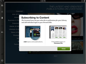 Publishers should note that Livestand has no information on getting your digital content to the app. Your customers can’t even add your RSS feed. Livestand seems to rely solely on the subscriptions users add to their Personal Mix. If your content is featured and someone selects it, you’re one of the lucky ones. But your customers can’t keyword search for content.
