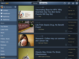 Unfortunately, all the slick functionality came to a screeching halt when I tried tuning the app manually under “My Interests”. It’s easy to set up new categories, either by clicking on their palette of existing categories, such as Travel, Education, Military, Markets, MLB Baseball, etc.; or, by typing in a keyword. Problem is, sometimes choosing a category abruptly closes the app. Or choosing multiple topical areas causes the app to layer the icons one atop the other in a blurred mish-mash of text and images. And the custom feed I set up to test “healthcare” failed to populate anything but a “come back later” sign after 24 hours. I found this hard to believe, given the prevalence of healthcare reform discussions daily, so checked on the News navigation bar under “Health” and there was plenty of content. Disappointing that my preferences are slow to load, if they did at all – feels like a letdown after the promise of über-customization.